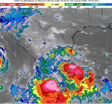 Por otra parte, una circulación anticiclónica en niveles medios de la atmósfera continuará generando tiempo estable y baja probabilidad de lluvia sobre la Mesa del Norte y el noreste del país. Finalmente, continuará el ambiente caluroso con temperaturas de 35 a 40 grados sobre entidades del noroeste del territorio nacional, siendo superiores a 40 grados en Sonora.