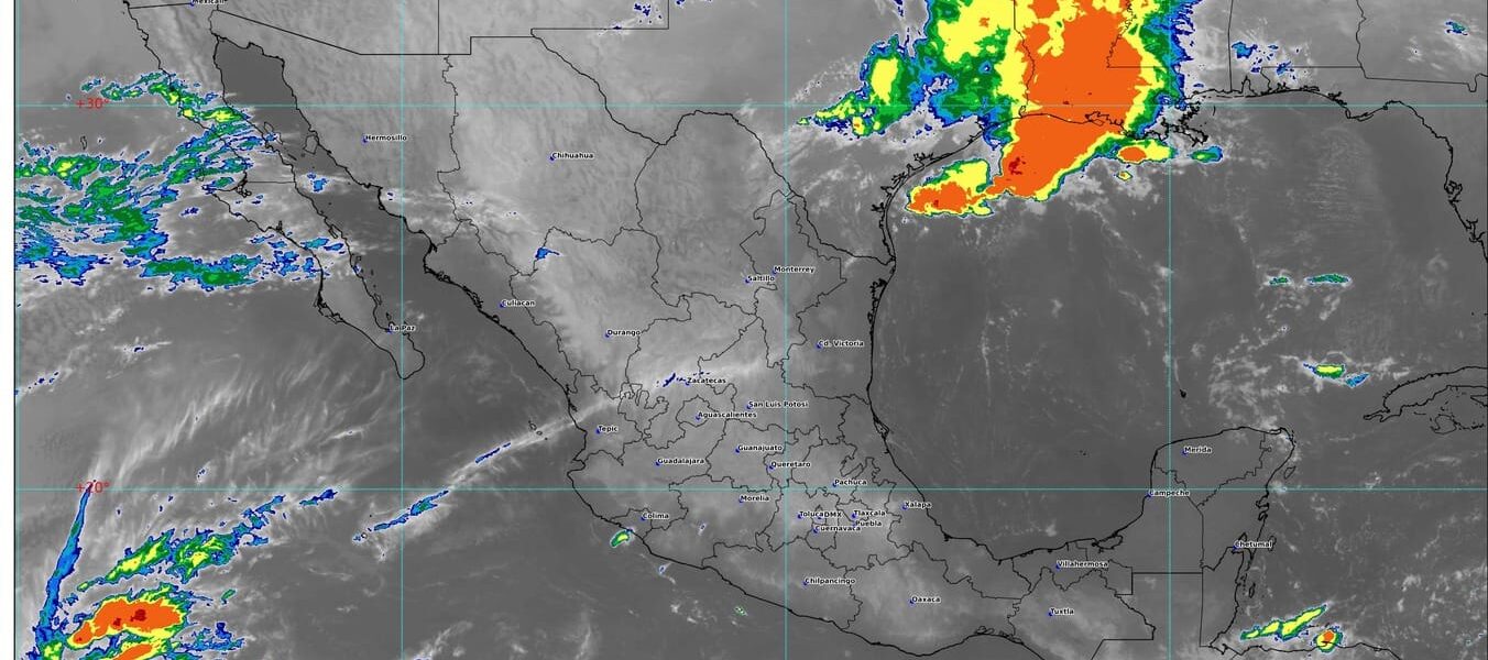 Simultáneamente, un canal de baja presión sobre el interior de la República, junto con el ingreso de humedad proveniente del océano Pacífico y el golfo de México, propiciará lluvias puntuales fuertes en el sur de Jalisco, norte de Colima y zonas costeras de Michoacán.