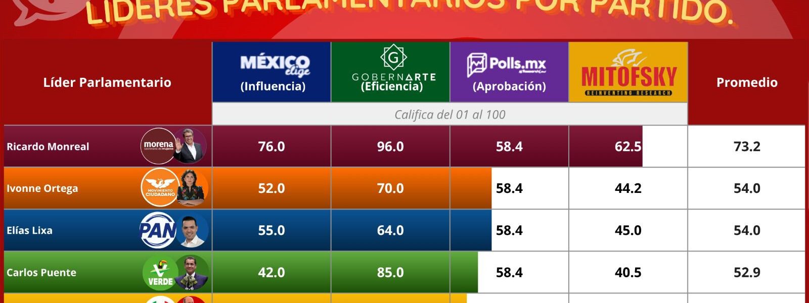 El estudio integra datos de cuatro mediciones distintas: México Elige (Influencia), GobernArte (Eficiencia), Polls.mx (Aprobación) y Mitofsky.